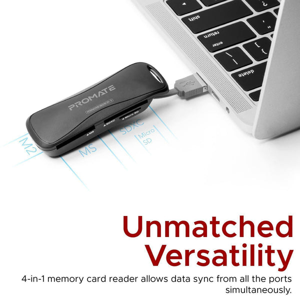 PROMATE 4-in-1 Portable Multi Memory Card Reader. Includes SD, MicroSD, MS and M2 Card Slots. USB 2.0 Type-A. 480Mbps Transfer rate. Plug and Play. Black Colour.