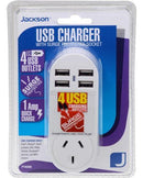 JACKSON Single Plug USB Wall Charger, 4x USB Charging Outlets (1A total), Power status indicator, Surge Protector